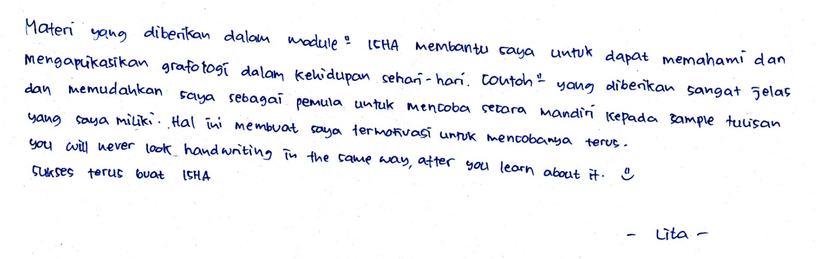 - Lulus: Certificate of Completion resmi dari KAROHS International School of Handwriting Analysis (USA)