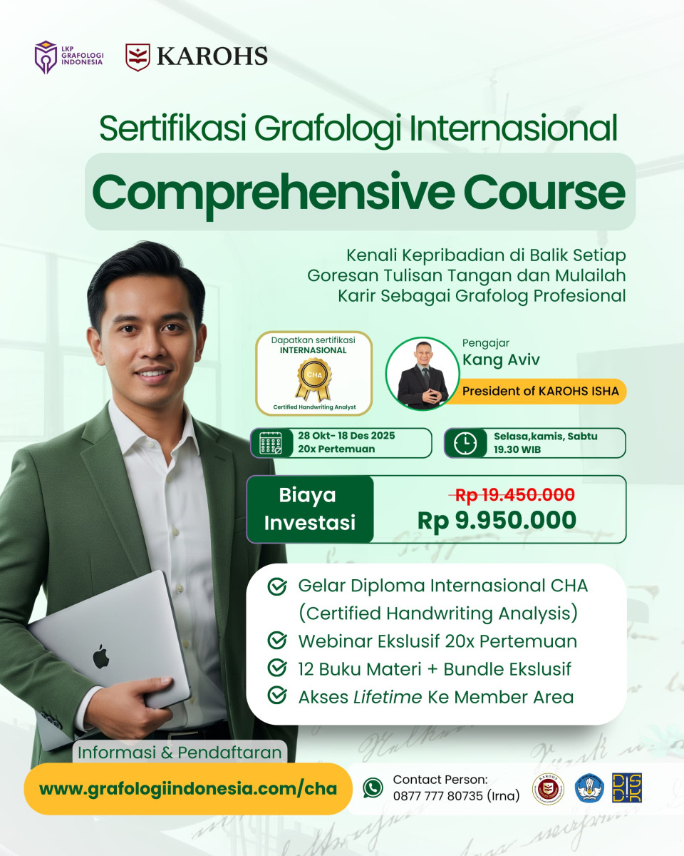 ✅ Sertifikat resmi dari KAROHS: CHA (Certified Handwriting Analyst