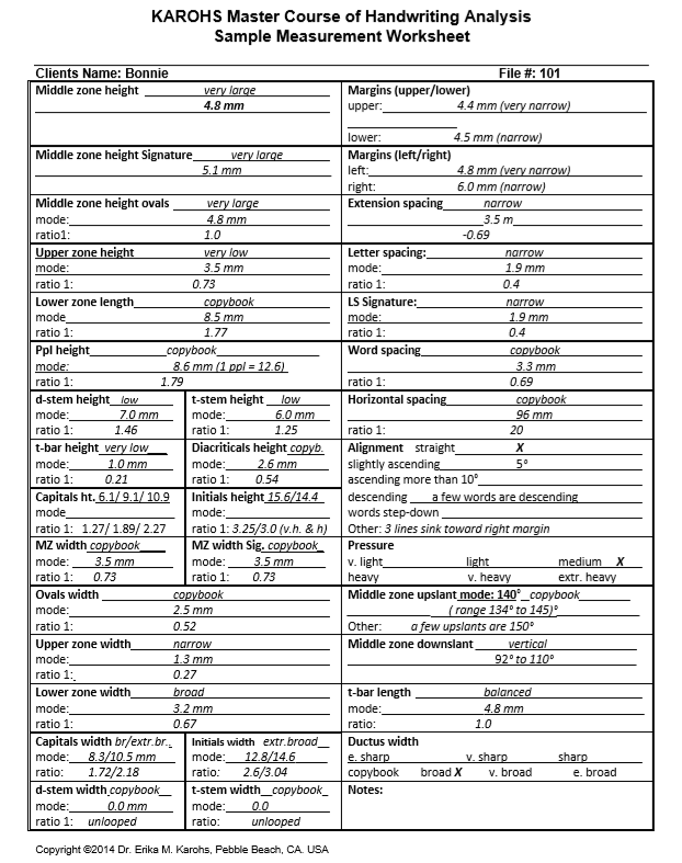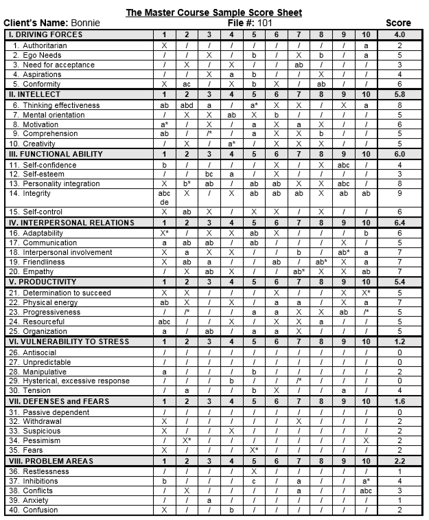 Pada setiap trait, Anda sebagai grafolog nanti dapat mengikuti panduan dalam “Book One: Scoring Guide” dan memberi skor pada ke-10 indikator. Sistem analisa ini membuatnya menjadi sangat akurat. Yang sangat penting adalah: setiap laporan analisa akan sangat menggambarkan si penulisnya dibandingkan analisa umum semata. Lembar Score Sheet ini menjadi panduan referensi bagi Anda sebagai analis.