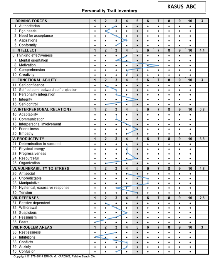 Hasil skoring trait di score sheet kemudian dipindah ke dalam tabulasi tabel grafik psikogram: Personality Trait Inventory yang terdiri dari 40 aspek yang dikelompokkan kedalam 8 sindrom (kelompok besar) sebagai berikut: