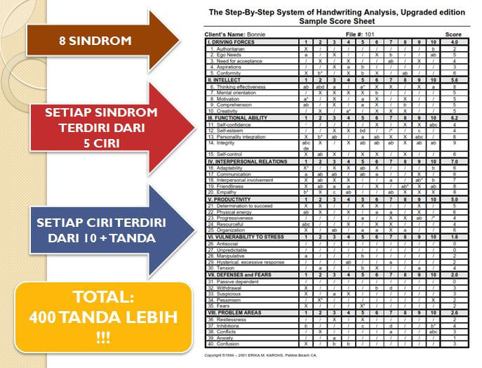 Pada setiap trait, Anda sebagai grafolog nanti dapat mengikuti panduan dalam “Book One: Scoring Guide” dan memberi skor pada ke-10 indikator. Sistem analisa ini membuatnya menjadi sangat akurat. Yang sangat penting adalah: setiap laporan analisa akan sangat menggambarkan si penulisnya dibandingkan analisa umum semata. Lembar Score Sheet ini menjadi panduan referensi bagi Anda sebagai analis.