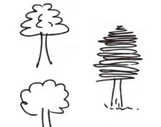 - Pohon yang dibuat secara membulat menunjukkan sifat ramah yang menyenangkan, sedangkan pohon yang dibuat meruncing atau banyak sudut keras menggambarkan orang yang tegas atau mudah menggugah.