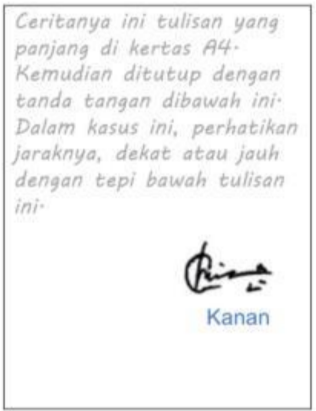 Jadi, posisi tanda tangan dibedakan menjadi vertikal dan horizontal. Untuk posisi vertikal terbagi menjadi posisi tanda tangan yang dekat dan jauh dari tulisan. Sedangkan untuk posisi horizontal terbagi menjadi posisi tanda tangan di kiri, tengah, sedikit kanan, hingga di kanan kertas.