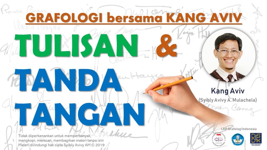 Semua materi ini disusun oleh Kang Aviv setelah melewati proses belajar dan pengalaman yang banyak, seperti: mempelajari lebih dari 100 buku grafologi terbitan dari berbagai belahan dunia, melewati lebih dari 20 tahun mempelajari grafologi dan mengikuti berbagai kursus, dilengkapi latar belakang Kang Aviv sebagai psikolog akan mewarnai materi yang Kang Aviv sampaikan penuh dengan warna-warna psikologi sehingga memudahkan Anda untuk mendapatkan gambaran aspek kepribadian. Kang Aviv juga sampai saat ini terus dalam bimbingan langsung oleh Dr. Erika M. Karohs, salah seorang ahli grafologi yang sangat dihormati dikalangan grafolog internasional.